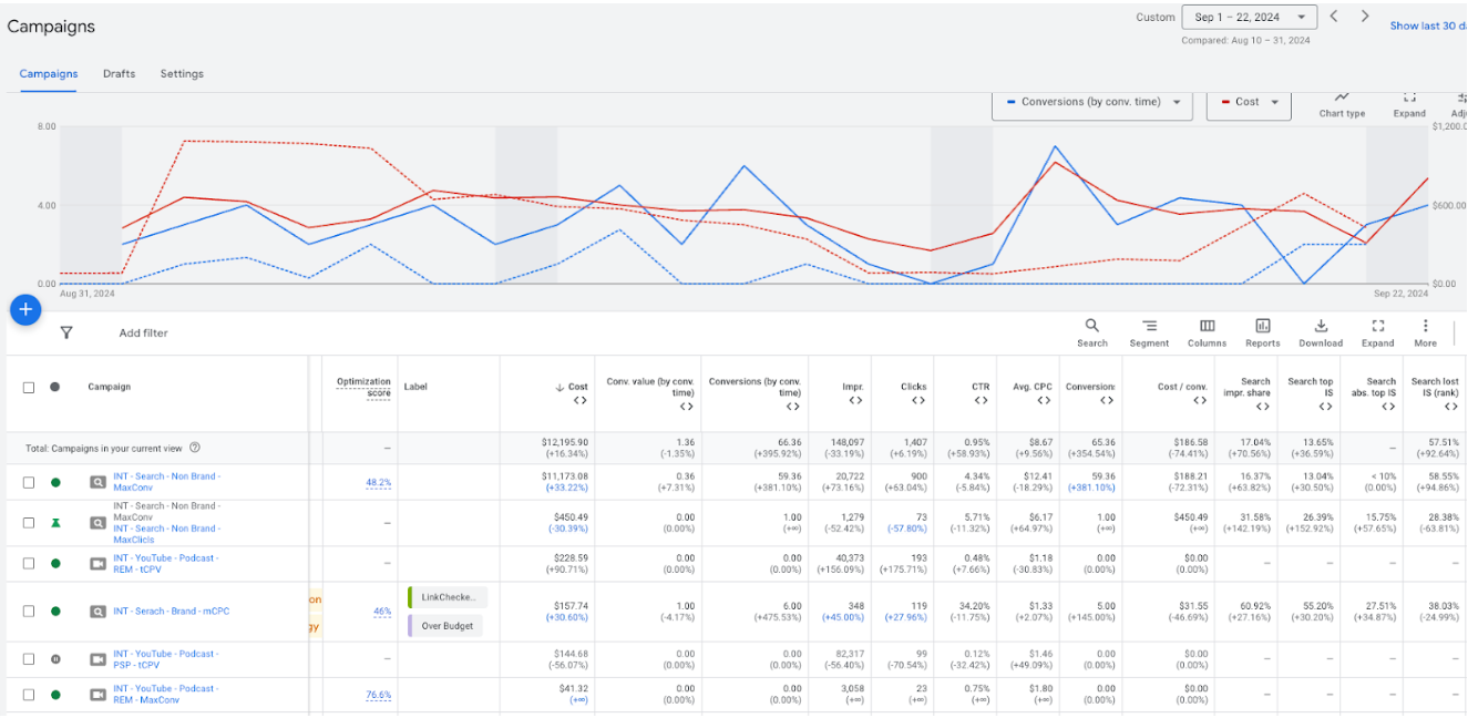 Ich habe die Kampagnen des Kunden von einer multinationalen Strategie auf eine US-zentrierte Kampagne umgestellt. Diese Konsolidierung beschleunigte den Lernprozess erheblich und ermöglichte es den Algorithmen von Google, schneller und effizienter zu optimieren. - Keyword-Strategie
