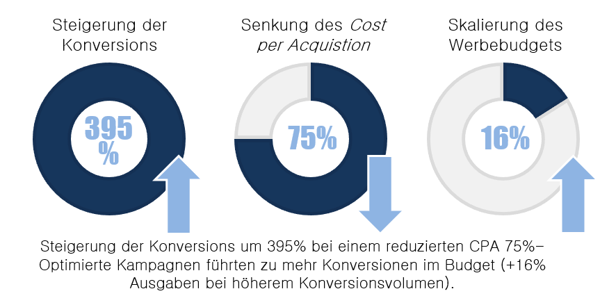 - Kosteneffizienz: Optimierte Kampagnen führten zu mehr Konversionen im Budget (+16% Ausgaben bei höherem Konversionsvolumen).