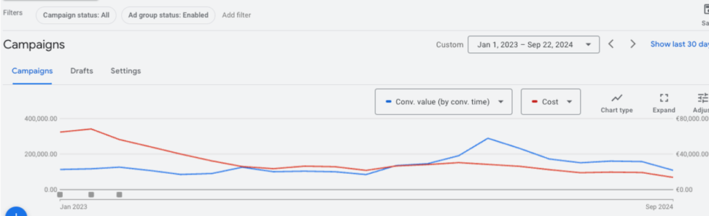The previous conversion tracking was flawed. I completely rebuilt the tracking system to accurately measure the performance of each campaign and make data-based decisions. Enhanced Conversions and most recently Consent Mode were installed. - Discontinuation of cold YouTube campaigns